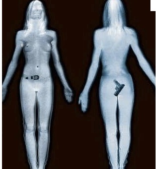 You stand in a long line with your ID out of its holder. You show it to a bouncer/SECURITY GUARD and are ushered through to the local open-mic dive bar/BACKSCATTER FULL BODY SCAN MACHINE. The guy/TSA OFFICER is fully clothed but can see you in all your naked glory.