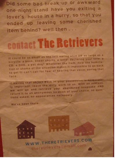 “Did some bad break-up or awkward one-night stand wake-up have you some lover’s house in a hurry, a frantic flurry, so that you ended up leaving some cherished item behind? Well then, contact the Retrievers.